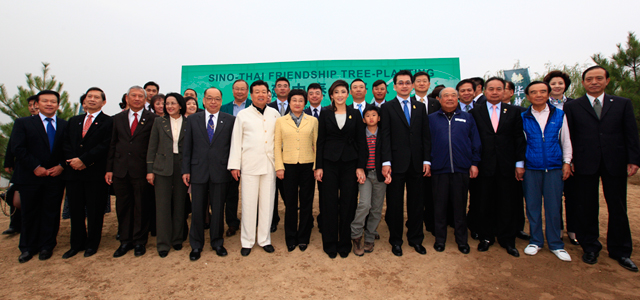4月19日,泰王國總理英拉?欽那瓦在國務(wù)院僑務(wù)辦公室主任李海峰,原對外貿(mào)易經(jīng)濟合作部部長、中泰友協(xié)會長石廣生,及中國證監(jiān)會首任主席劉鴻儒等領(lǐng)導(dǎo)陪同下,訪問了位于北京昌平的華彬莊園,在“中泰友誼林”種下了象征兩國人民深厚友誼的松柏樹,并參觀了“中泰攜手防風(fēng)治沙圖片展”。